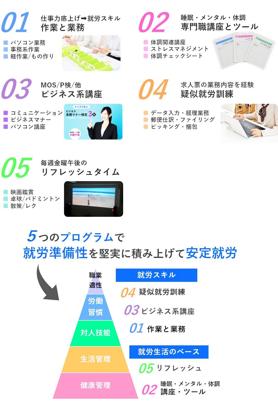 プログラムは就労準備性の理論にそって、コンディションの安定から就労スキルまで確実に積み上げていけるように組まれています。